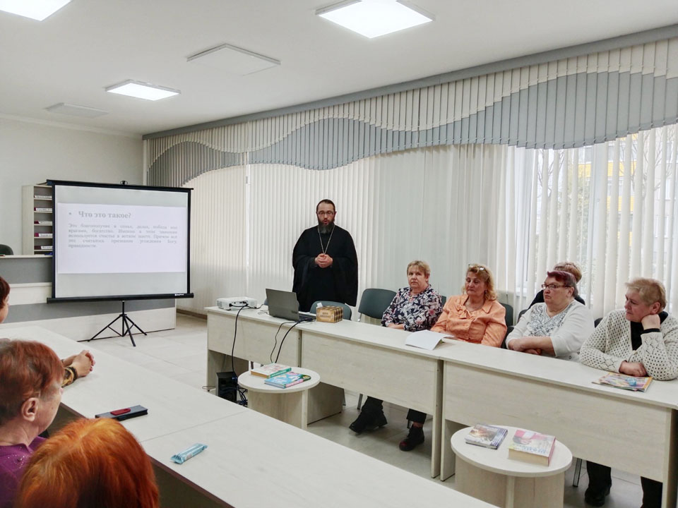 14 марта 2025 года в День православной книги в ГУК «Стародорожская районная центральная библиотека» прошла встреча со священником Димитрием Сильвановичем, клириком прихода храма святителя Николая Чудотворца г. Старые Дороги. Беседа была организована по просьбе участников клуба для женщин пожилого возраста «Посиделки» и была посвящена счастью.