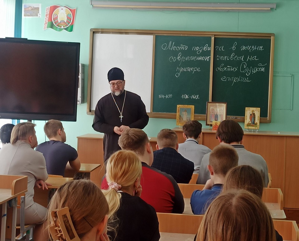 Настоятель храма святителя Николая Чудотворца аг. Тимковичи Копыльского района протоиерей Михаил Мордвинов рассказал ученикам о праведной жизни святой Софии, княгини Слуцкой, о страдальческой кончине младенца Гавриила Белостокского и Слуцкого, о свидетельстве до смерти за Христа новомучеников Слуцкой епархии.